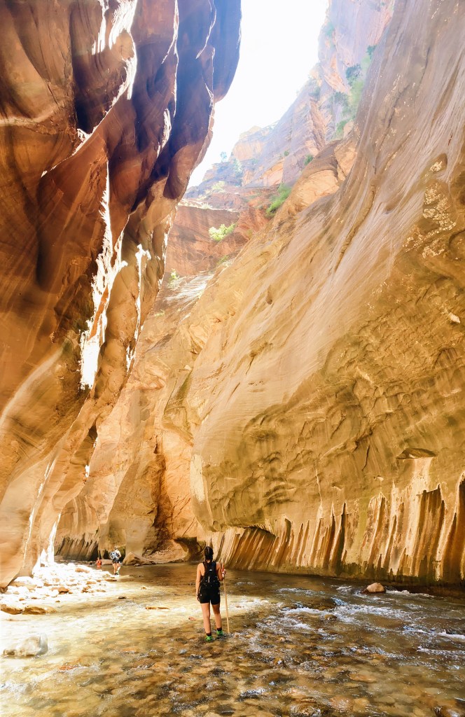 Aunque en el propio parque y en algunos centros de aventura veas que en la ruta cada sección tiene un nombre, cuando la hagas no verás ningún cartel ni sabrás exactamente por dónde vas, así que déjate llevar y disfruta de las enormes paredes que te rodean. Los últimos tramos de este hike te regalan los pasajes más bonitos; es increíble la sensación que una tiene cuando se siente dentro del cañón de Zion caminando por sus aguas.