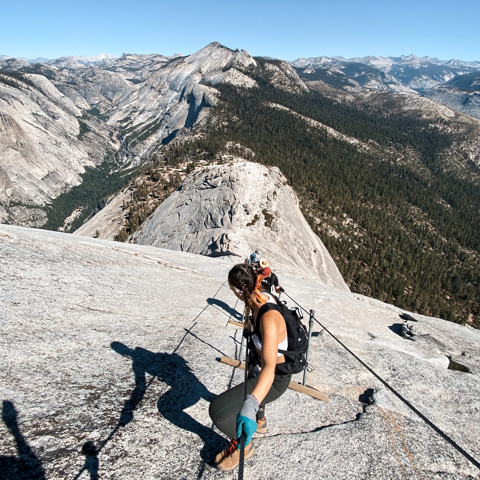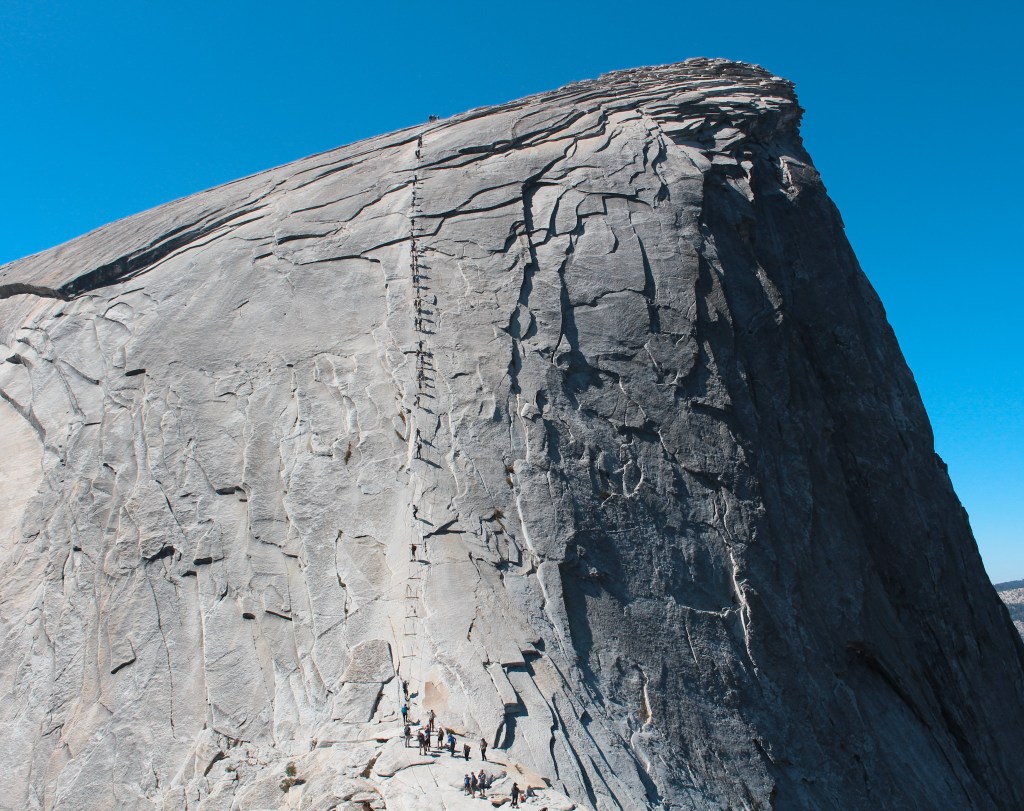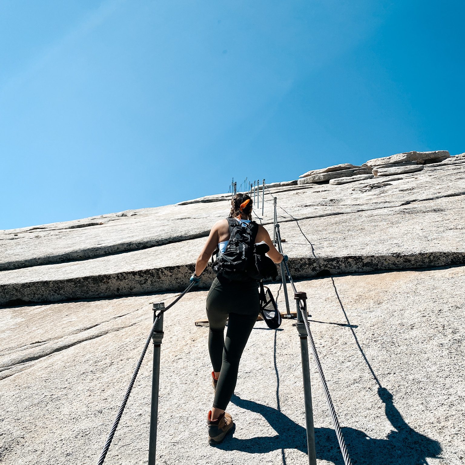 28 km de ruta con un desnivel brutal que consiste en coronar el Half Dome. Es una ruta muy especial porque justo al final del trail hay que subir una pared vertical donde puedes sujetarte de unos cables (puedes verlo en la siguiente imagen).